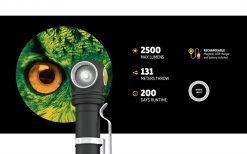 The ArmyTek Wizard C2 Pro headlamp and multi-purpose flashlight is the latest upgrade to the Wizard series. It offers a higher max output of 2500 lumen and features a cool white CREE XHP50.2 LED with a peak beam distance of 143 yards. Users can effortlessly choose from this light’s four mode groups using the conveniently located single-button side switch; 3 Turbo settings, 3 Main settings, 3 Firefly settings, and 3 Strobe settings.