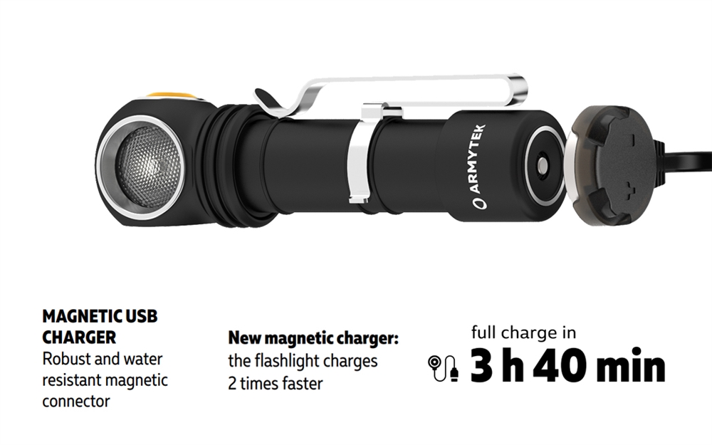 The Wizard C2 Pro runs on an included 3500mAh 18650 battery and can last up to 200 days on the lowest mode. To charge, simply snap the magnetic USB charging cable to the base of the light. With the newly improved magnetic charger, the Wizard C2 Pro can be fully charged in under 4 hours.