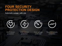 - Short-circuit, over-current, over-voltage, and reverse polarity protection