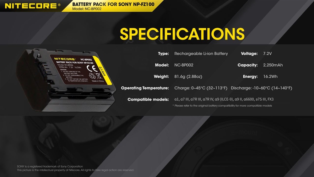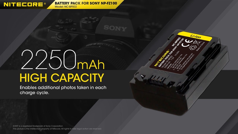 The NC-BP002 is a drop in replacement for the Sony NP-FZ100 battery to take your filming to the next level. The NC-BP002 is compatible with the top of the line mirrorless alpha 7 and 9 series from Sony. Never miss the perfect moment and take up to 490 photos on a full charge, with the high capacity 2250mAh rating.