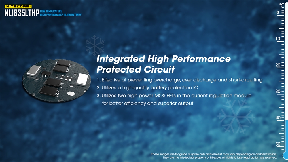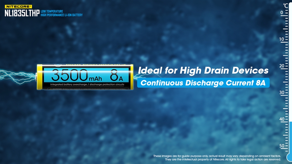 Made to perform in freezing temperatures, Nitecore NL1835LTHP 18650 battery triples the typical 18650 battery discharge efficiency at -40F, which makes it a great power source for low temperature applications. It comes with a respectable 3500mAh energy storage capacity. An ideal companion for all 18650 compatible devices in cold climate.