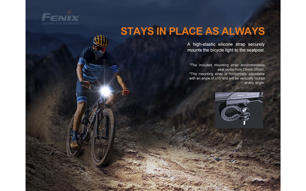 The mounting bracket included with the BC26R can be attached to bike frames 28mm-35mm wide. The flashlight can then be easily snapped on and off the mount, leaving the mount attached to the handlebars. The durable all-metal housing is rated IP68 making it dustproof, waterproof, and shock absorbent for riding on the toughest trails. The large single top button can be quickly tapped to cycle between the four brightness modes or a flashing mode to adjust to your environment.