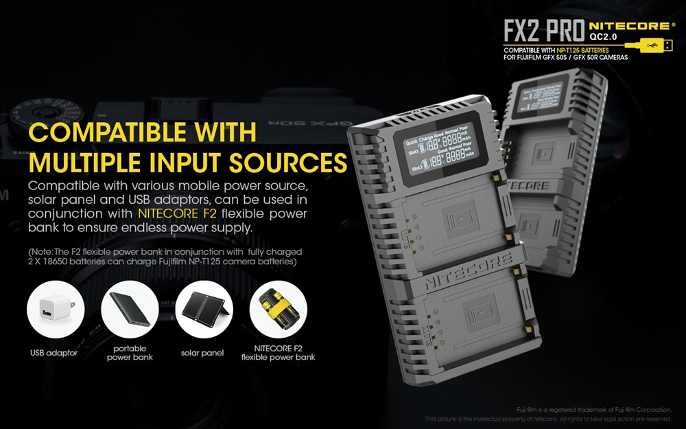 Fujifilm NP-T125 batteries for GFX 50S and GFX 50R camera models. Connect the FX2 Pro to a quick charge (QC) power adapter and a single slot will achieve a max output of 800mA for fast, efficient charging. Using a QC device or adapter, the FX2 Pro simultaneously charges two batteries in only 3 hours so you can spend less time charging and more time snapping photos.