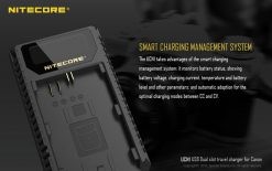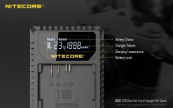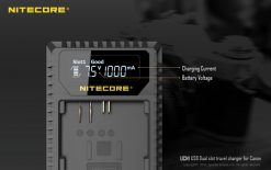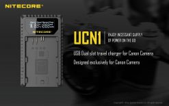 Nitecore UCN1 Dual-Slot USB Travel Charger designed to recharge the following Canon camera batteries: LP-E6, LP-E6N, and LP-E8. This lightweight and compact battery charger features a built-in USB charging input that stows away in a secure groove to save space and prevent damage. The UCN1 has a dual port design to charge LP-E6/LP-E6N batteries on one side and LP-E8 on the reverse.