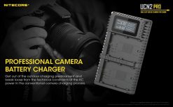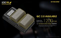 Introducing the NITECORE UCN2 Pro intelligent USB dual-slot superb battery charger designed to recharge Canon LP-E6N batteries fast, safe and efficiently. The UCN2 Pro can charge two LP-E6N batteries simultaneously with a maximum output of 800mA in either slot when using a 2A output USB power adapter. When the charger is connected to a quick charge (QC) power adapter, the screen will show Quick Charge and a single slot will achieve a max output of 1200mA. The UCN2 Pro supports the LP-E6N battery for popular Canon EOS models including 5D Mark II, 5D Mark III, 5D Mark IV 60D, 70D, 6D, 6D Mark II, 80D, 7D and 7D Mark II cameras.