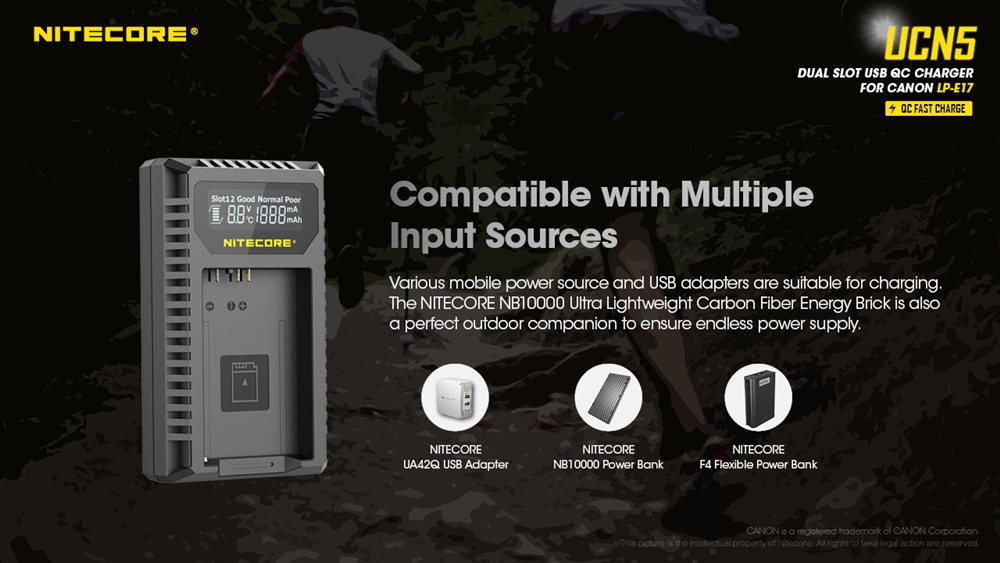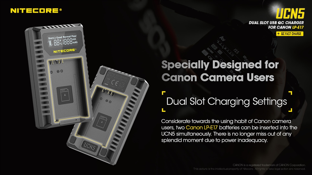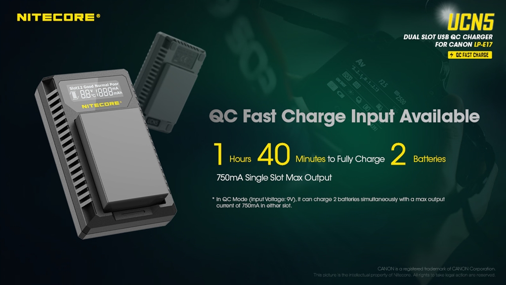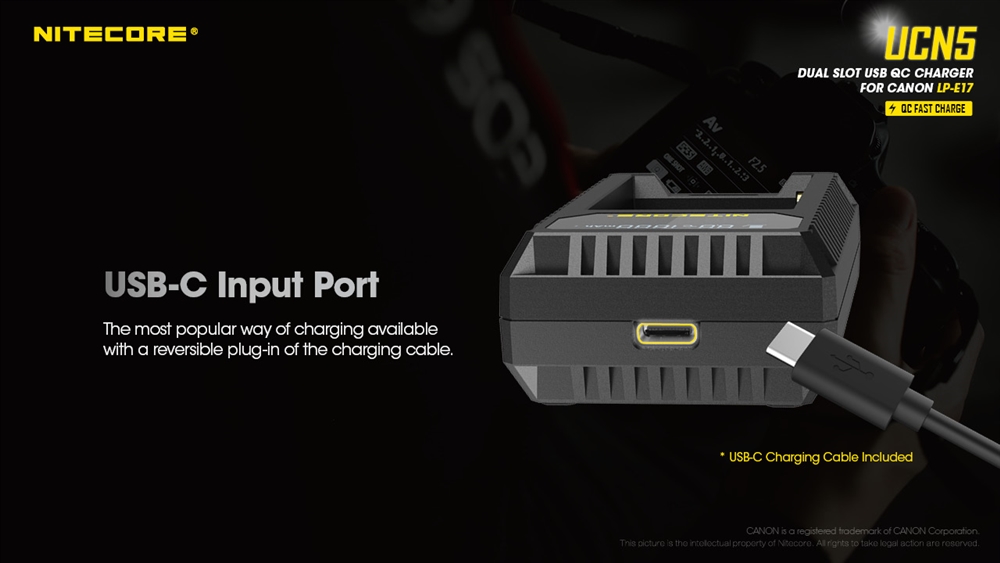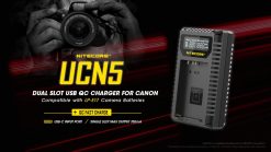 Introducing the NITECORE UCN5 Dual-Slot USB-C QC battery charger specifically designed for Canon LP-E17 camera batteries. When using a QC2.0+ compatible adapter, the UCN5 can charge two batteries simultaneously or achieve a max 750mA charging current in one slot so you can spend less time charging and more time capturing photos.