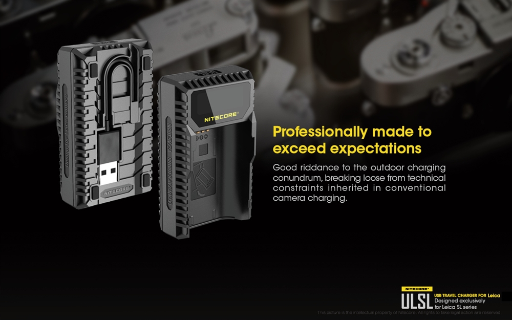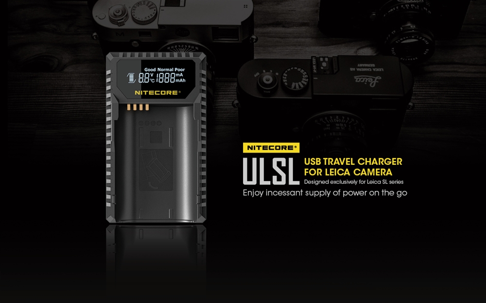 Introducing the Nitecore ULSL USB Travel Charger designed to recharge Leica BP-SCL4 batteries. This lightweight and compact battery charger features a built-in USB charging input that stows away in a designated secure trough to save space and prevent damage.