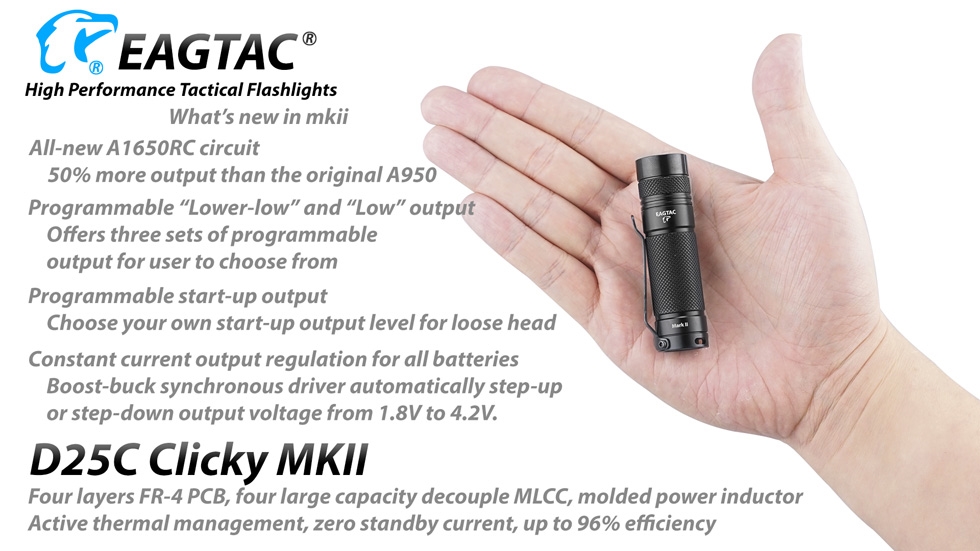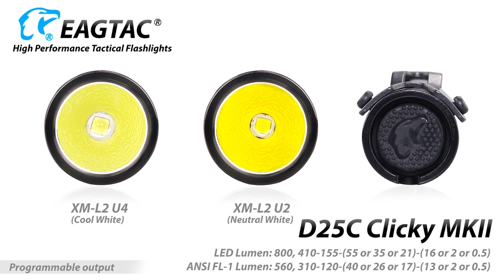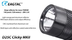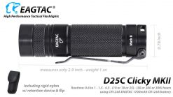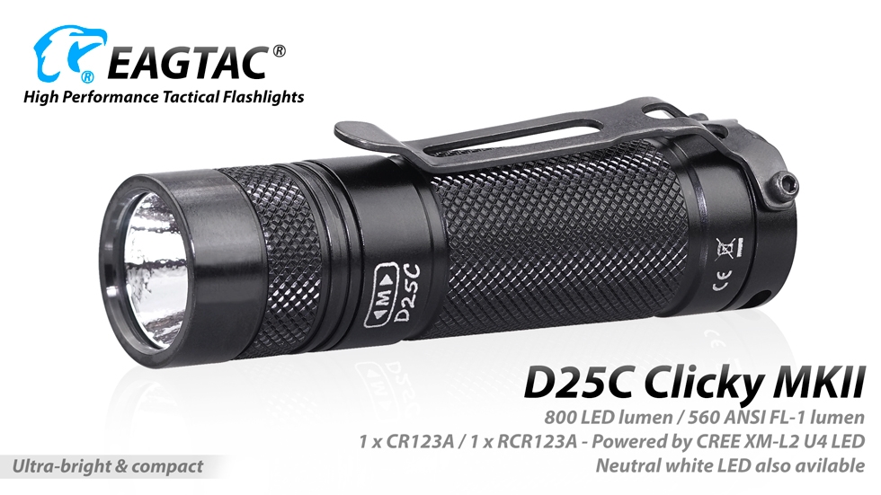 Eagletac has revamped the popular D25C Clicky and introduced a brighter and more powerful Eagletac D25C Clicky MKII. The D25C Clicky MKII operates with a single commonly available CR123A battery and is equipped with a CREE XM-L2 U4 LED capable of producing a bright 800 lumens with up to 140 yards of throw. Boasting 5 brightness levels and 4 auxiliary modes, the D25C Clicky MKII is suitable for any outdoor, tactical or emergency application.
