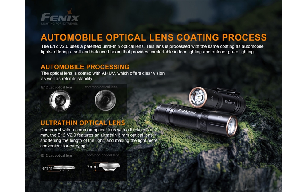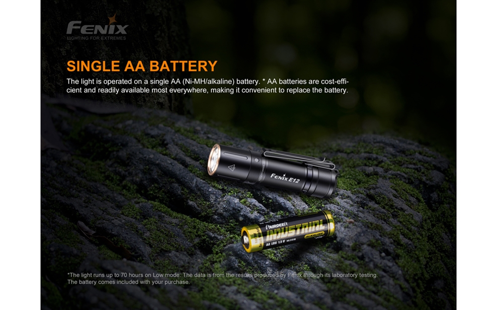 The Fenix E12 v2 is a compact EDC flashlight fueled by a single commonly available AA battery. Weighing under one ounce and measuring just 3 inches, the E12 v2 produces up to 160 lumens of light, with a throw over 75 yards.
