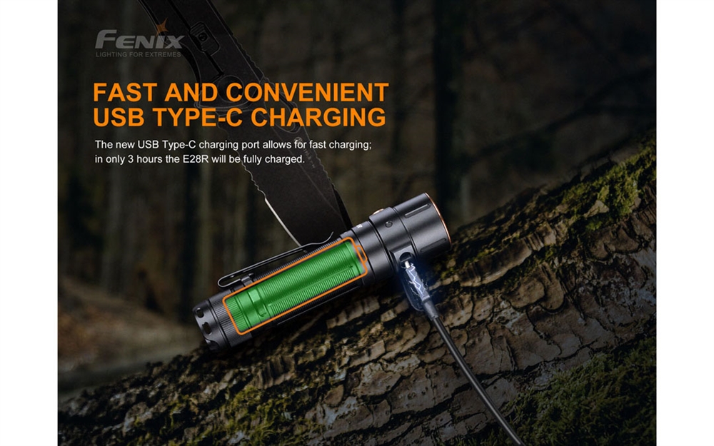 Fenix E28R runs over 2 hours on high and over 73 hours on eco, with the included high capacity 3400mAh rechargeable battery. Single click the switch when the light is off for a visual indication of the power level. When it is time to recharge, just snap the included USB-C charging cable into the light and connect with any USB power source. In just three hours, E28R will be charged and ready to go again.