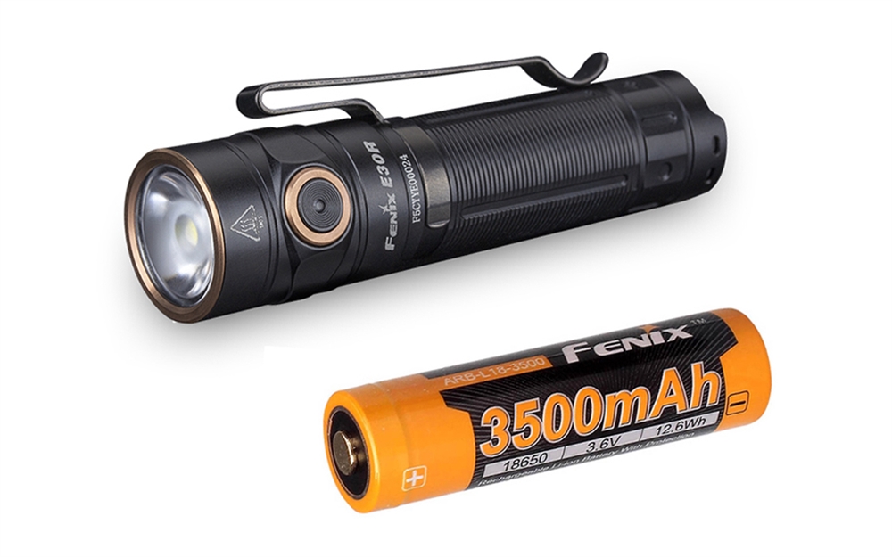 The Fenix E30R rechargeable flashlight throws a super bright beam up to 1600 lumens reaching over 650 feet on a single 18650 battery. This powerful new flashlight is designed with everyday carry (EDC) in mind. Measuring only 3.9 in length and weighing under 1.8 oz, the E30R fits comfortably in your hand or pocket.