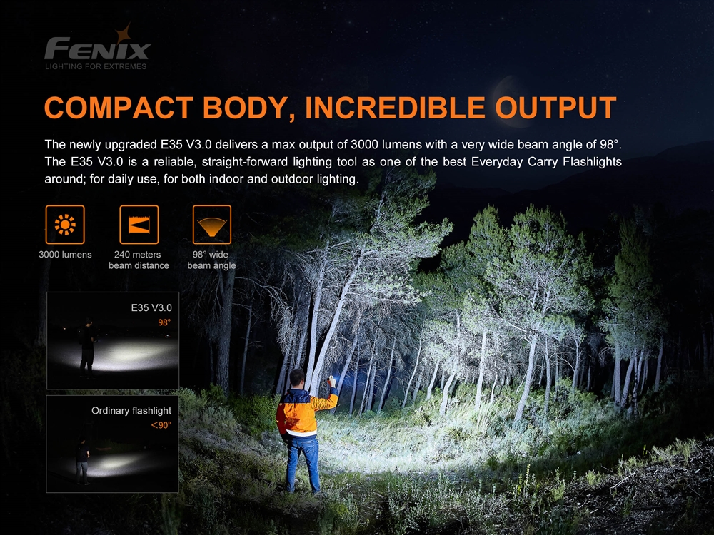 Pushing EDC flashlights to the next level, the Fenix E35 v3 rechargeable flashlight throws a super bright beam up to 3000 lumen reaching over 262 yards. This powerful new flashlight is designed with everyday carry in mind. Measuring under 4.7 inches long and weighing 2.36 oz, with a titanium coated clip, comfortably carry the E35 v3 walking the dog, poking around the garage, or in your pocket or bag, ready for daily use.