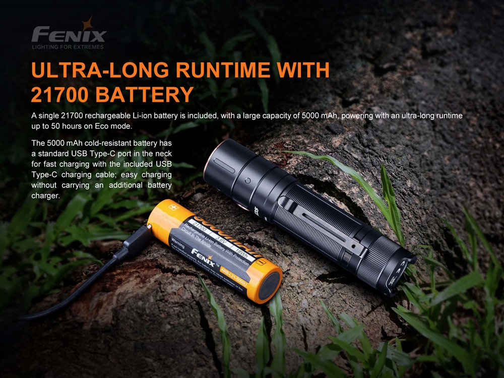 Never worry about batteries with Fenix E35 v3. It runs over an hour on turbo and 50 hours on eco, with the included high capacity 5000mAh rechargeable battery. Single click the switch when the light is off for a visual indication of the power level. When it is time to recharge, just snap the included USB-C charging cable into the battery and connect with any USB power source.