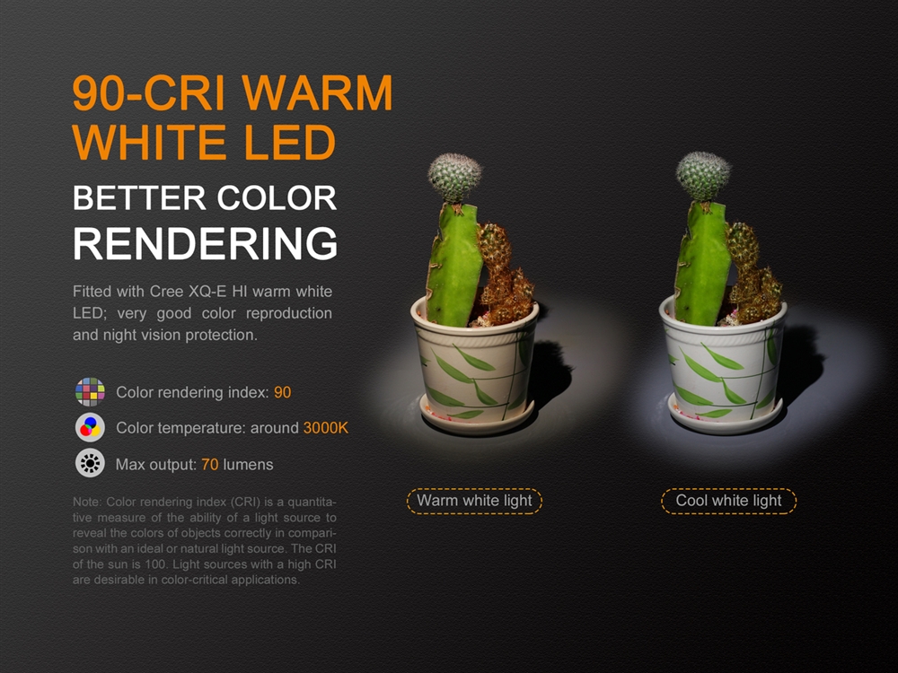 - CREE XQ-E LED with a CRI rating of 90 for a warm, sunlight like beam.