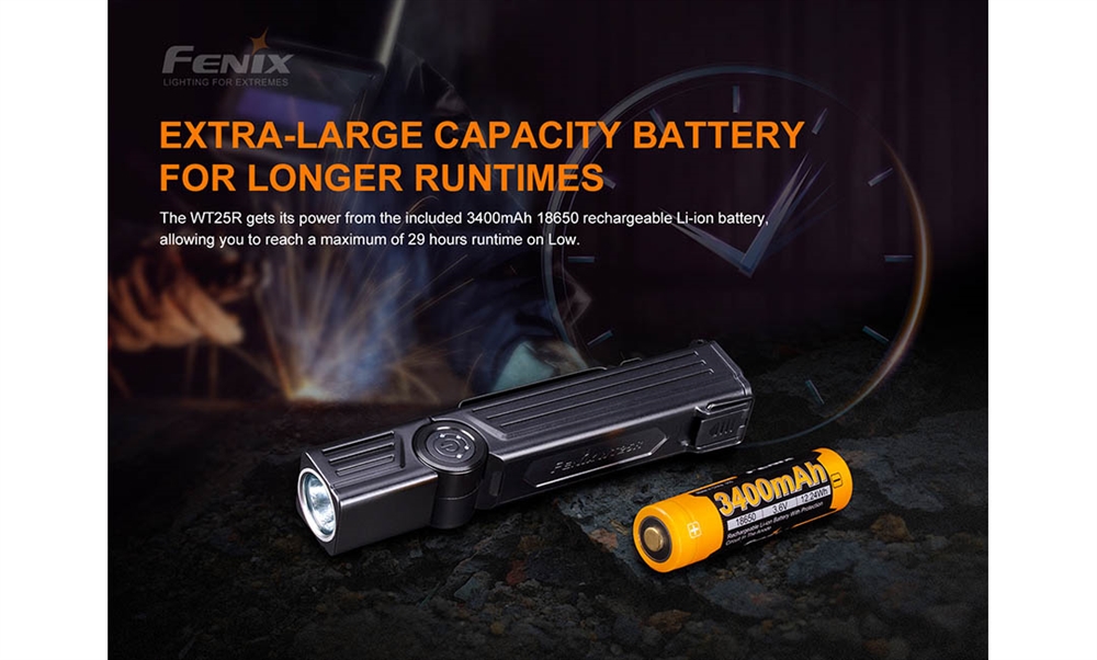 The Fenix WT25R work flashlight is a professional grade tool for the toughest jobs. The WT25R outperforms traditional work flashlights with a 1000 lumen max of evenly distributed light via the orange peel reflector. No workspace is the same which is why the WT25R can adapt to any situation with its adjustable pivoting head. Then you can position the WT25R wherever you please with its magnetic base, titanium coated pocket clip, or just tail stand it.