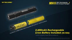 The MH11 comes with an included 18650 battery that can be fast charged via the built-in USB-C port on the side of the flashlight. Fully charged, the included battery can power the MH11 for up to 250 hours or 10 days on low mode! The power indicator tells you the battery status and reminds you to recharge. Additionally, the MH11 can run on two CR123A batteries.
