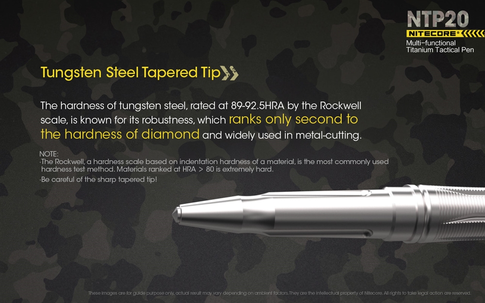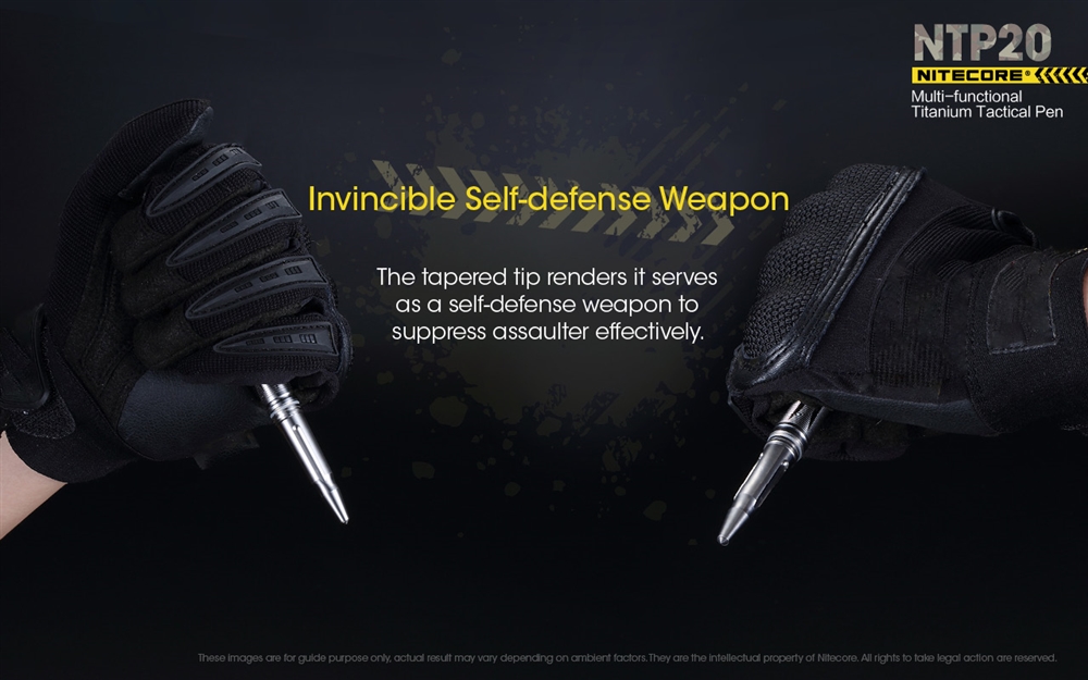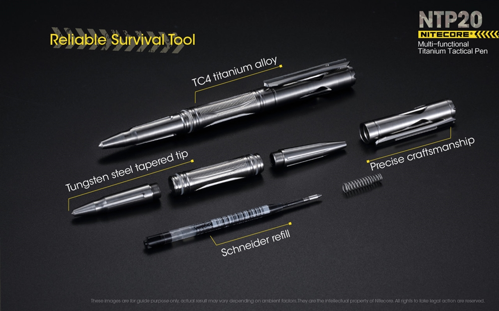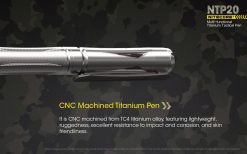 The NITECORE NTP20 is the anticipated update to the NTP10 tactical pen. On one end, the tungsten tapered tip functions as an effective glass breaker to smash windows or as a tool for self defense. On the other, a high quality German gel ink refill and a stainless steel tip offer smooth writing that is quick-drying, waterproof, and fade-resistant.