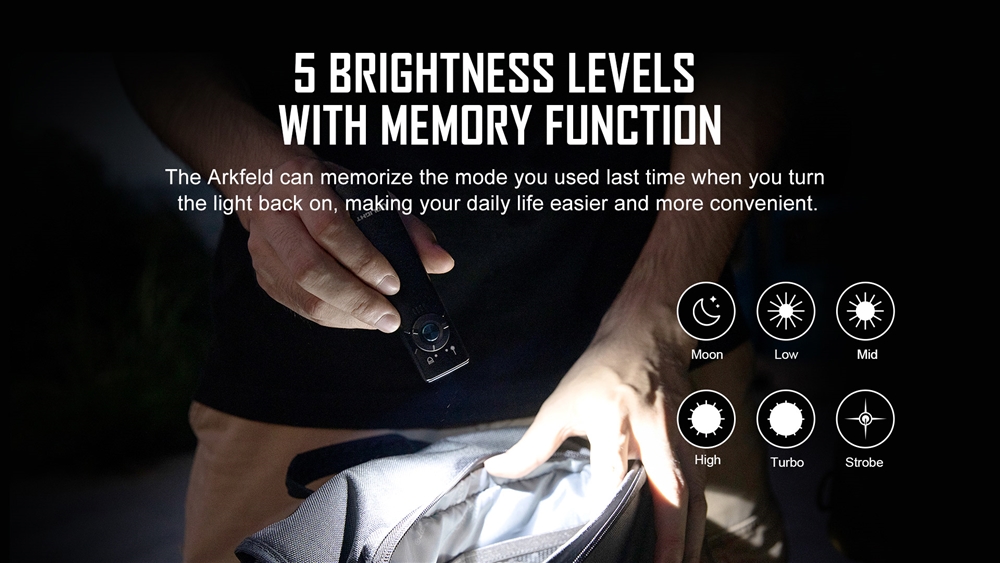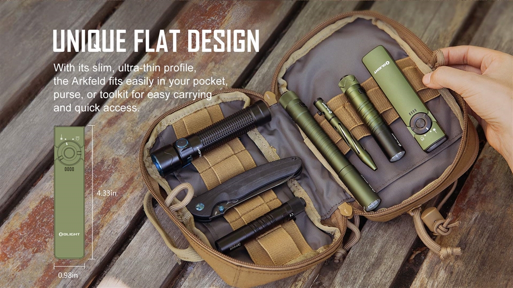 The Olight Arkfeld is a 1000 lumen flashlight with green laser pointer that will bring a breath of fresh air to your EDC kit. The unique slim ultra-thin profile can easily slip into your pocket, or use the clip to secure it to straps, or loops. The bright green laser pointer is an excellent tool for surveying, presenting, or demonstrating; while the flashlight is a perfect EDC companion for emergencies or daily tasks. The smooth uniform lines of the Olight Arkfeld feel great in hand and looks coolon your instagram.