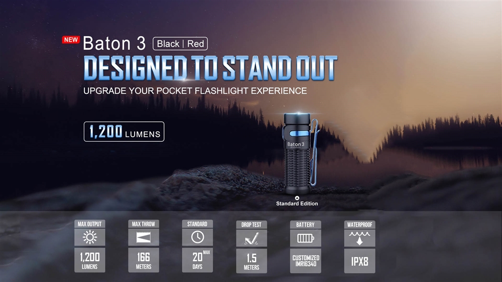 The Baton 3 maintains the same dimensions as its predecessor at 2.48” long and only 1.8 ounces so it fits comfortably in any pocket or bag. Use the dual-direction pocket clip to secure the light during travel or for hands-free options. Impact resistant and rated IPx8 waterproof, everywhere is a possibility with this everyday carry flashlight.