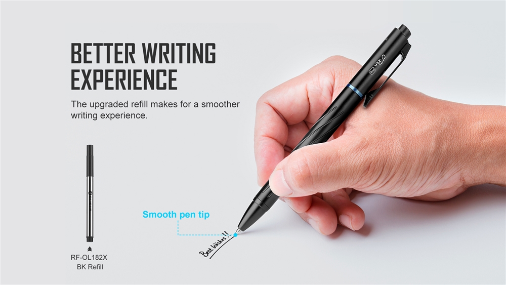 The exquisite and elegant appearance with dynamic spiral textures allow for easy handling all day.. With a strong hard anodized aluminum alloy body and a stainless steel pocket clip, OPen Pro is durable yet lightweight at only 1.3oz, well suited for everyday carry on job sites, patrols or anywhere else. Keep the OPen Pro with you to light up and write down any inspiration.