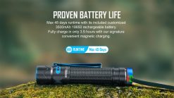 The Olight Warrior Mini 2 comes with the 3500mAhrechargeable battery that provides 45 days of runtime on low. The side switch has a built-in battery level indicator, helping you keep it charged and ready. Charging is quick and easy with the magnetic charging cable, just snap it to the bottom of the light.