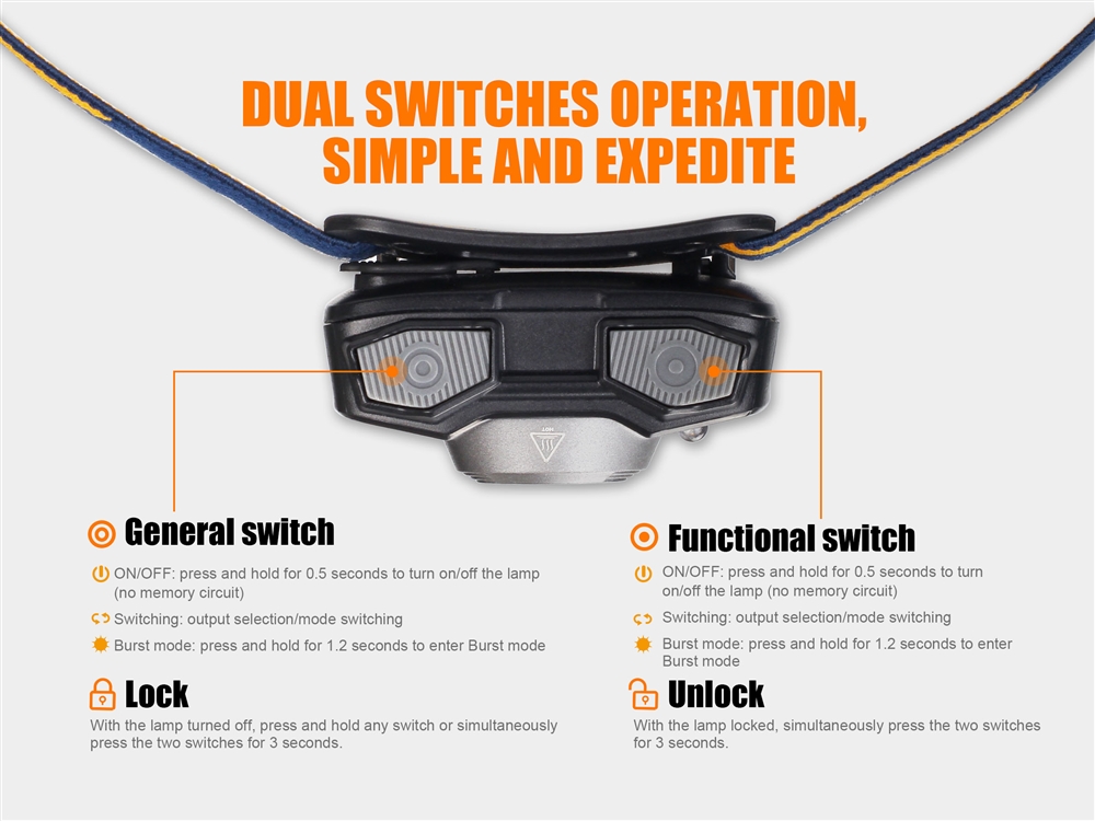 Dual switches (General and Function) located on the top of the unit offer direct access to white and red output modes, adjusting brightness levels and accessing special modes. A lockout function is also available to help preserve battery life by preventing accidental activation. The built-in battery indicator allows users to check battery levels anytime by single clicking the Functional switch while the unit is off. The large capacity battery can easily be recharged by connecting the charging cable (included) to the unit’s built-in micro-USB port and any compatible USB power source. The HL32R is IP66 rated, making it both dust and water resistant and includes a reflective sweat-channeling headband to protect the unit from indoor and outdoor elements.