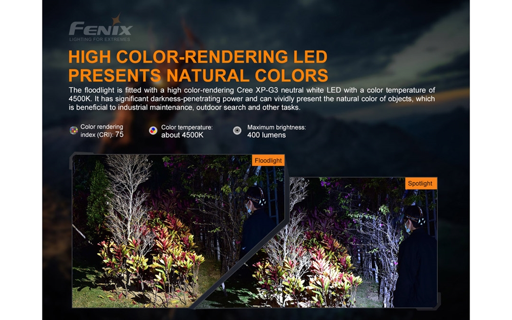 The Fenix HP16R is a multifunctional headlamp for casual users on late night runs, to camping trips, all the way to seasoned mountaineers and explorers. The headlamp produces a max 1250 lumens when both the 1250 lumen spotlight and 400 lumen floodlight are activated. The primary spotlight covers all of your hardcore outdoor lighting needs. The secondary floodlight is a >75 high CRI neutral light for night photography, or enjoying nature. The tertiary red light is a must have for hunters, fishers, and emergency or auxiliary users.