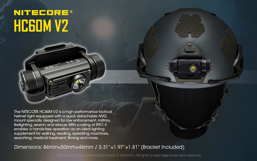 The HC60M v2 snaps into a helmet with a NVG mounting bracket. Its wide angle beam with five brightness levels provides up close and middle range illumination. You can also swivel the headlamp up and down to easily adjust the beam direction. Its durable metal construction and an IPX7 waterproof rating ensure this headlamp can withstand indoor and outdoor elements and is ready for your next mission!