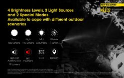 - 4 brightness levels and 2 special modes (SOS and Beacon) of white light
