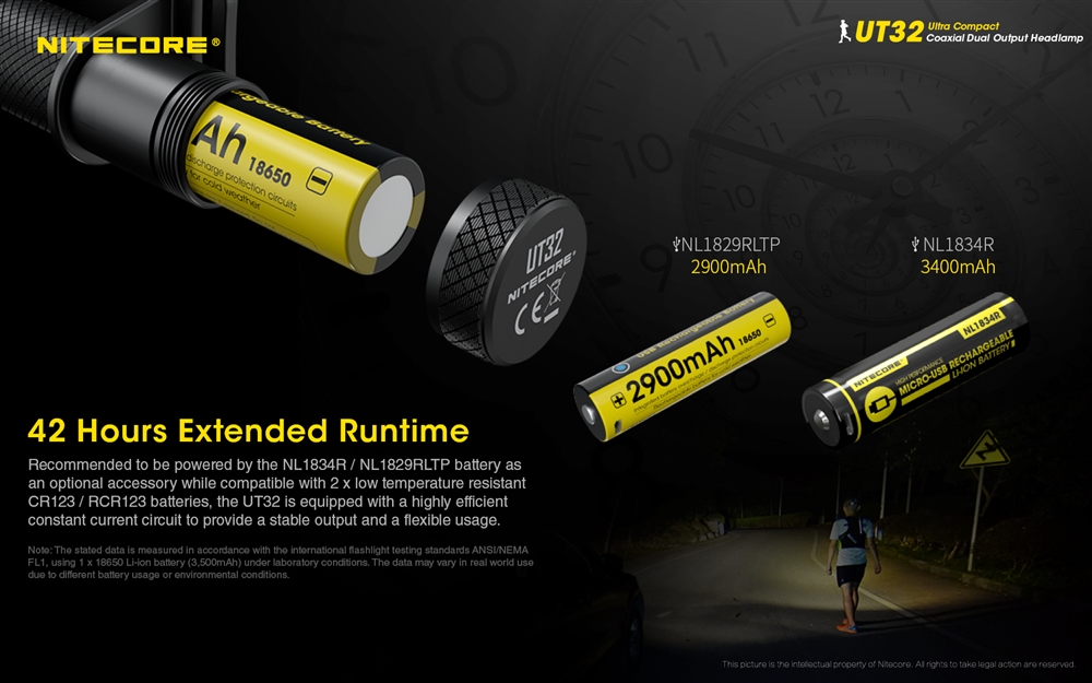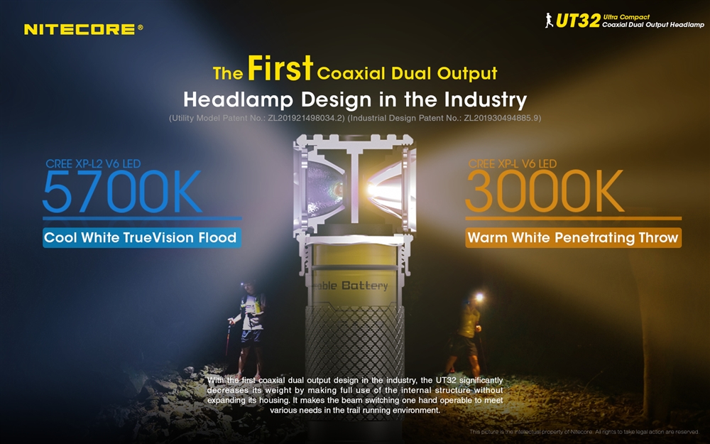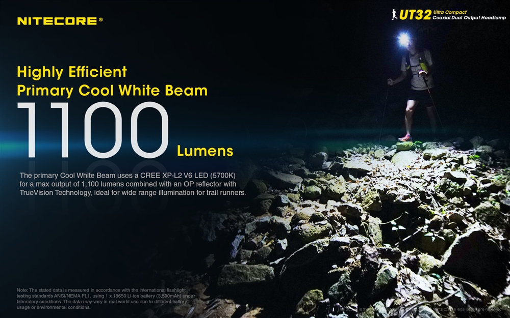 The NITECORE UT32 is the first dual output headlamp of its kind, designed specifically for safe trail running. The UT32 comes with a user-friendly dual button interface, allowing easy access to both a 1100 lumen cool white beam and a 920 lumen warm white beam. to cut through the harshest weather conditions. Reaching up to 87 yards, the 100-degree cool white flood beam is ideal for wide range illumination. Use the warm white beam to cut through the harshest weather conditions for up to 127 yards.