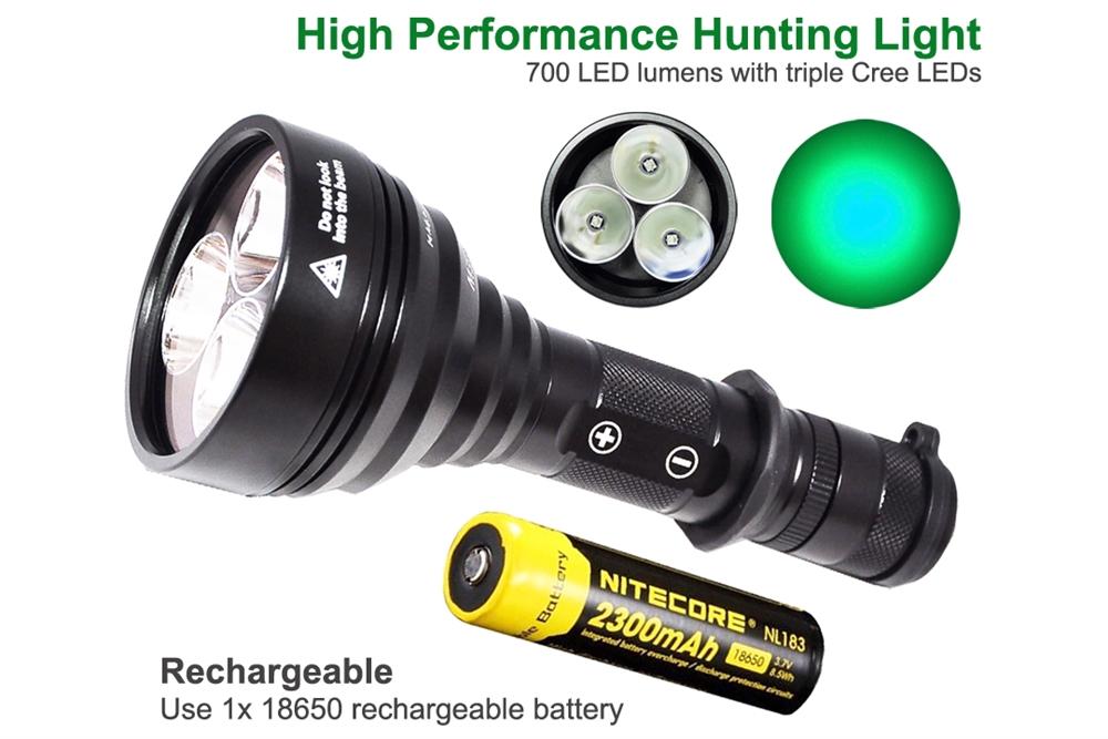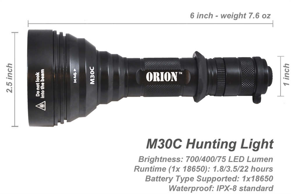 At 700 lumens, the Orion M30C is the brightest predator light available. Each light is quipped with three CREE XP-E2 color LEDs. Choose between red or green 100% pure light with no loss from filtering.
