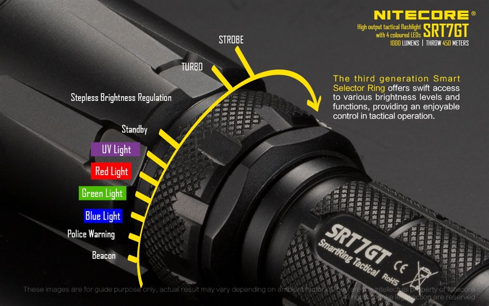 SRT7GT Tactical Flashlight is an upgraded model from the ever popular SRT7. Now equipped with the sophisticated CREE XP-L HI V3 LED, it gives off up to 1000 lumens of vibrant white light visible up to 1500 feet away. Nitecore’s Third Generation patented Smart Ring technology allows it’s users control of infinite brightness variables and access to different outputs with extreme ease. In conjunction to the three static and infinite variable brightness modes, the SRT7GT is stocked with 4 secondary color LEDs (Red, Blue, Green, and Ultraviolet) allowing for a trio of special outputs, such as strobe, beacon, and a Red/Blue police signal. Constructed from aerospace grade aluminum alloy and coated with a military grade hard-anodized finish, the SRT7GT is as durable as it is versatile. It can resist falls up to 1.5m and is protected from water damage with it’s IPX-8 rating in water damage making it waterproof up to 2 meters, making this flashlight a necessity for military personnel , security, and first responders.
