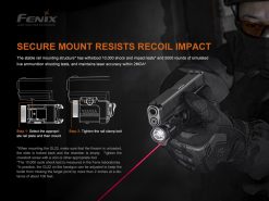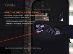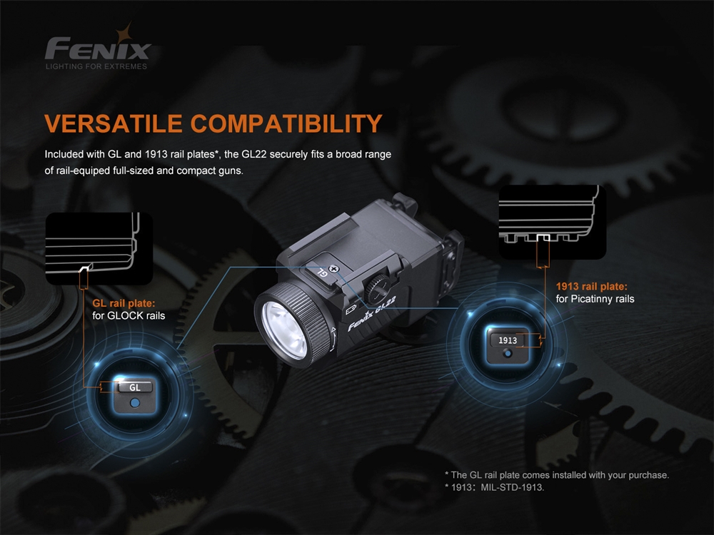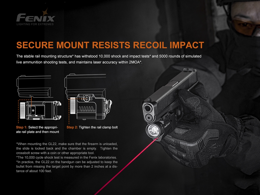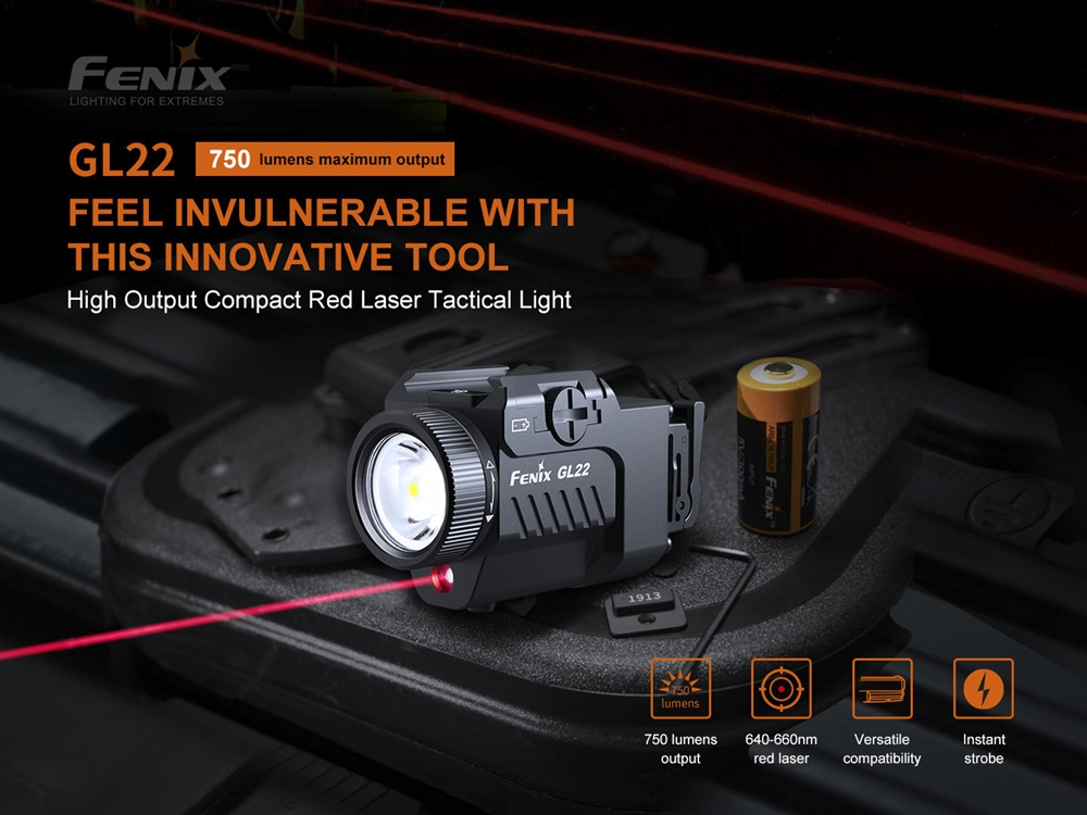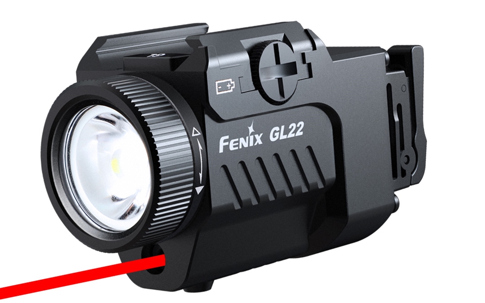 The Fenix GL22 is a tough and thick 750 lumen rail mounting flashlight and red laser sight combo. The GL22 mounting plate can be adjusted to fit most full size,and compact pistols with 4 inches or longer accessory rail. This bright red laser sight Class IIIa (<5mw) means easier target acquisition and target practice under any light condition. The primary light is powered by a Luminus SST20 LED, for a 750 lumen max that can reach up to 196 yards. The frame is constructed from durable aluminum yet only 3.32 oz and incredibly compact, a great addition to any carry firearm.