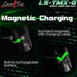 The LaserTac TMX-G is a rechargeable slim profile green laser sight with ambidextrous switches and pulse mode. With its sturdy steel bolt it snugly fits most full size and compact pistols with 4 inches or longer accessory rail. It can also fit any rifle and shotgun with a Picatinny accessory rail. This bright green laser sight (Class IIIa 515nm, <5mW) is visible even in broad daylight, which means easier target acquisition and target practice under any lighting condition. With its low profile design and 1.16oz weight, you wonโt even notice the TMX-G is there.