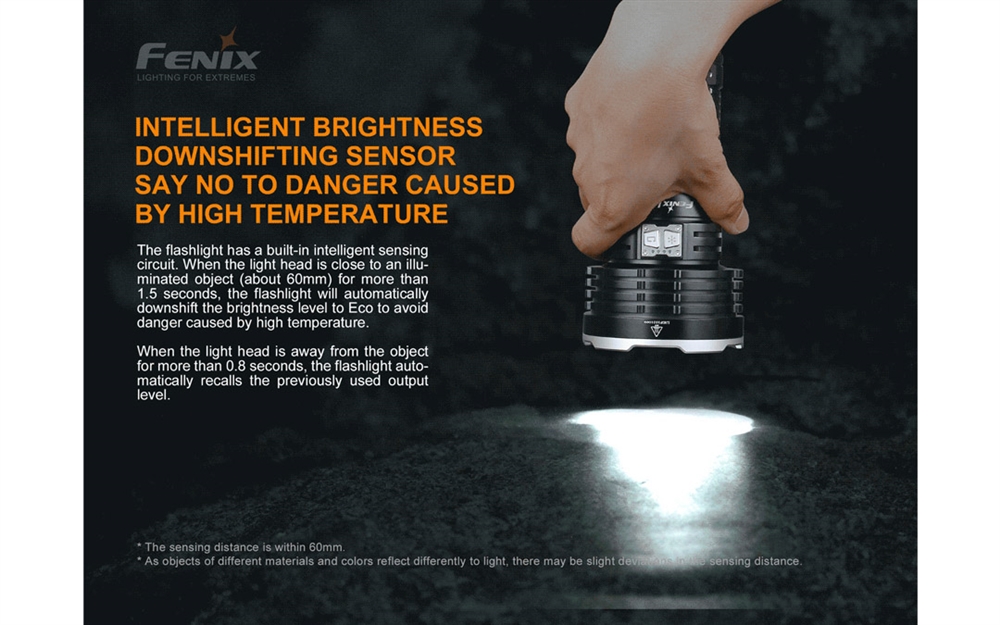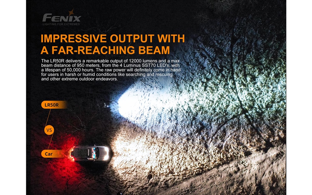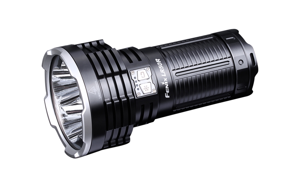 The Fenix LR50R USB-C rechargeable flashlight throws a super bright beam of 12000 lumens reaching over 1,038 yards. This is the brightest flashlight made by Fenix specifically designed for search and rescue but can be used for caving, exploration, hunting or any outdoor activity. A must-have for collectors and a great gift for enthusiasts.