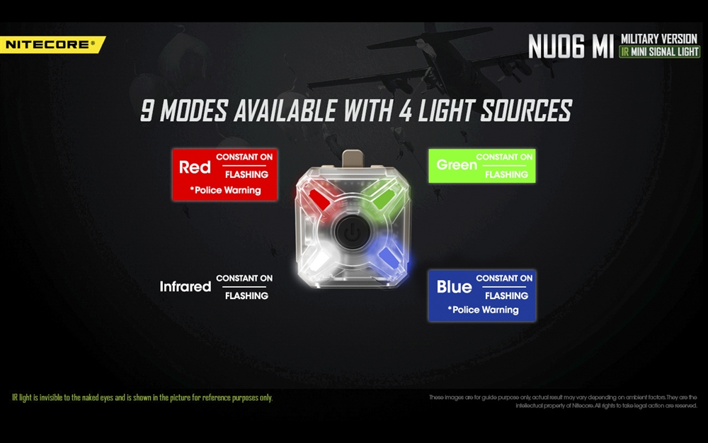 The NU06 MI is a mini LED safety and signal light specifically designed for outdoor activities and law enforcement personnel. It comes with four LEDs in a compact X formation: IR, blue, green and red. Each LED can be activated on a constant-on, a flashing mode, and a setting allows for red and blue LEO flashing as a warning signal. The IR LED allows for signaling and identification with special night vision equipment and gear.