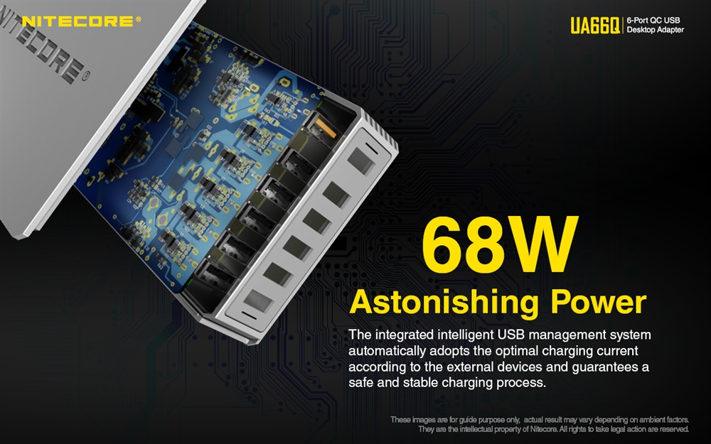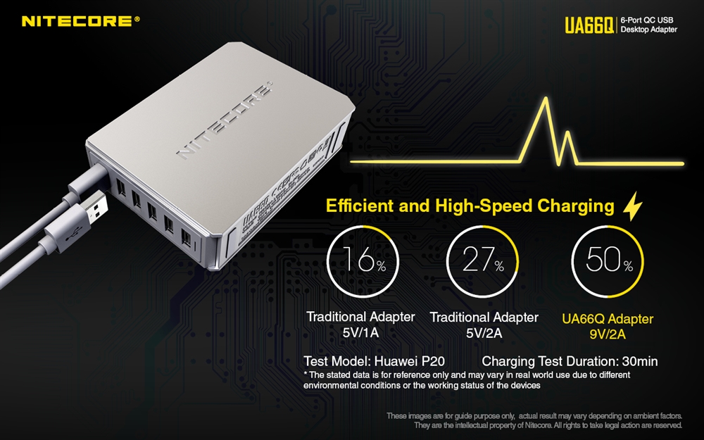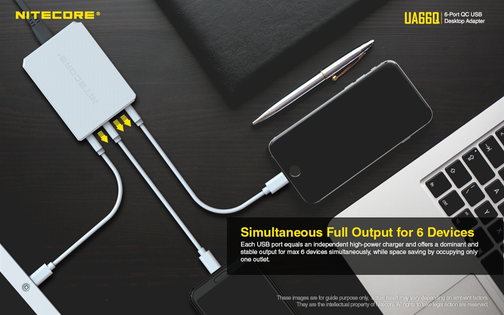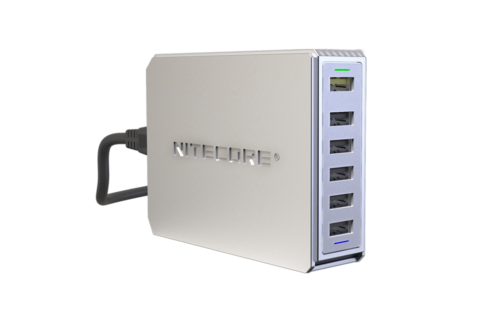 NITECORE UA66Q charges six USB devices at once with a single wall outlet and pushes 2A current on 6 ports. The sixth port is a quick charge slot which reduces charging time by 50% for devices that are compatible. This means time-saving fast charging for all your electronics like Android, iPhone, tablets, iPad, game controllers, and of course, USB rechargeable NITECORE flashlights.