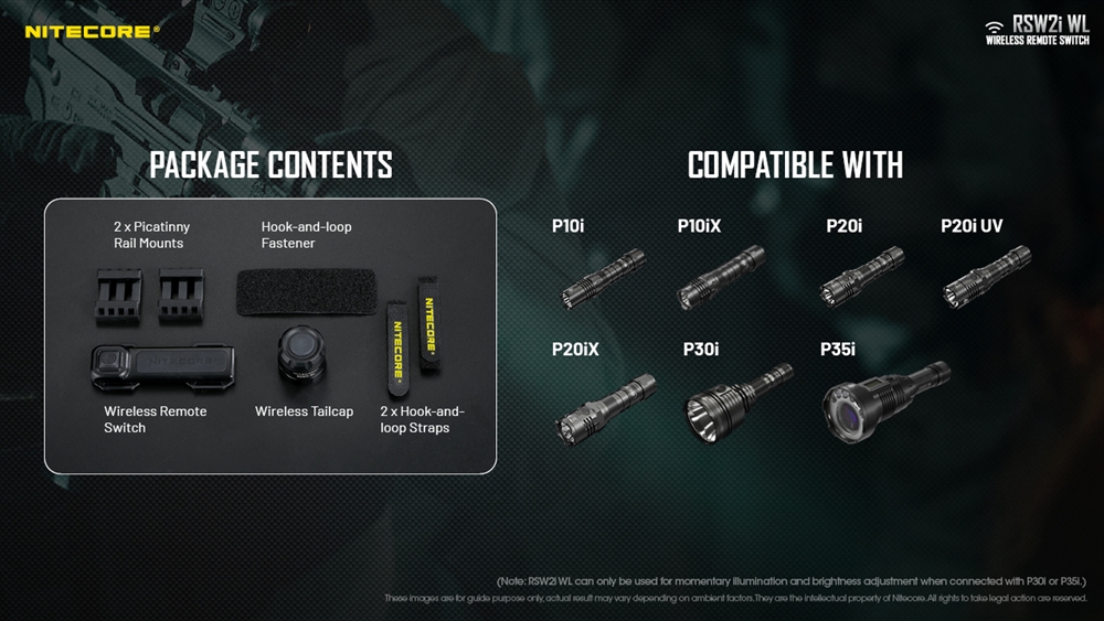 The Nitecore RSW2i WL is a wireless pressure switch designed specifically for the Nitecore intelligent Series flashlights. It operates on the 2.4G wireless bandwidth for a secure connection and frees up clutter and tangles from your rail section for enhanced operation. It’s a direct drop in, plug and play for any iSeries flashlight. Just unscrew the regular tail cap, install the new tail cap and you are good to go.