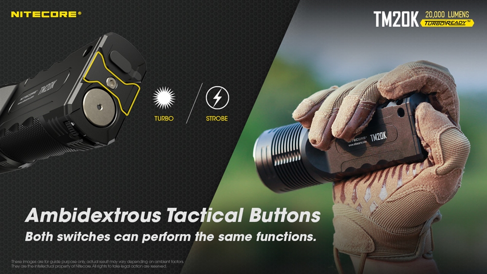 The NITECORE TM20K is the brightest of the Tiny Monster series, yet still remains a compact handheld size thanks to new technology and improved design. This high performance flashlight is a true factotum of illumination with 19 LEDs for a powerful 20,000 lumen max that is astonishing output and cut through 317 yards of the darkness. The TM20K can be used for anything from outdoor activities, industrial uses, self-preservation through active threat mitigation, search and rescue.