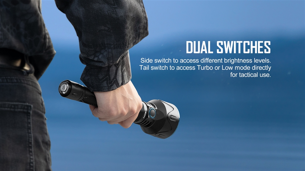 The Javelot Pro features an easy to reach silent dual-switches. Use the tactical tail switch to directly access the turbo and low mode and the side switch to cycle through all four brightness settings. The slim handle provides a stable balance point for mounting on anything from scopes to barrels while the deep knurling pattern provides excellent grip for handheld use.