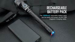 The Javelot Pro 2 has been fitted with a removable battery pack that comprises two 5000mAh 21700s for extended runtimes up to 12 days on a single charge. Why take it out, when you can just use Olight’s magnetic charging cable to snap onto the tailcap for fast 2A charging. The quad LED battery level indicator by the side switch provides fast and intuitive readout.