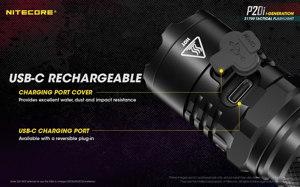 The P20i runs on an upgraded 21700i battery. This enables higher efficiency output and minimizes loss of power, achieving 90 minutes on high and a max runtime of 50 hours on low. Charge the P20i via the fast charge USB-C port. With an IP68 waterproof rating and a covered charging port, the P20i can be used safely in any climate.
