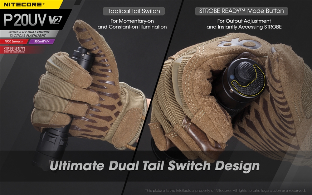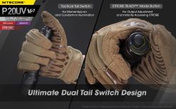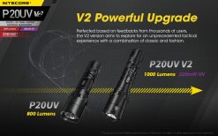 The NITECORE P20UV v2 has been refined based on 1000s of user comments to provide you with the best tactical experience possible. This flashlight throws 1000 lumens over 179 yards, boasting 2.5 hours of run time on high and up to 46 hours on low. The dual-switch tailcap makes for easy one-handed operation with direct access to turbo and strobe. At under 6 inches and just 4.71 oz, an IP68 rating, and 1 meter of impact resistance; the new P20UV v2 is ready for duty.