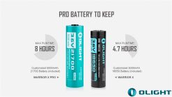 The Olight Warrior X Pro is the latest upgrade of the well-known Warrior X. Brighter with longer throw and runtime, the Warrior X Pro emits up to 2100 lumens of neutral white light at an impressive throw distance of 546 yards. Powered by a 5000mAh 21700 Li-ion battery, this super thrower is equipped with 100% faster charging speeds and the ability to run for up to 8 hours, giving you more time to use the light.