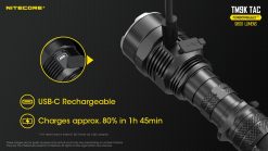 The TM9K TAC also has a rechargeable 5000mAh Li-ion battery built-in. The TM9K tac is USB-C rechargeable, and comes with a charging cable included. It is even capable of quick charge (QC) technology to speed up the charging process. When the light is connected to a QC power source, the battery status indicator will blink rapidly and the light will be fully charged in a little over three hours. You also can lock out the flashlight to save the battery and prevent accidental activation when it is not in use.